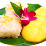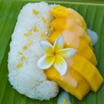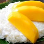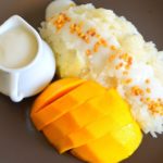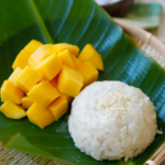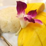 - Dans une assiette, ajoutez un peu de riz gluant et parsemez-le de graines de sésame. Disposez ensuite les morceaux de mangue sur le côté.