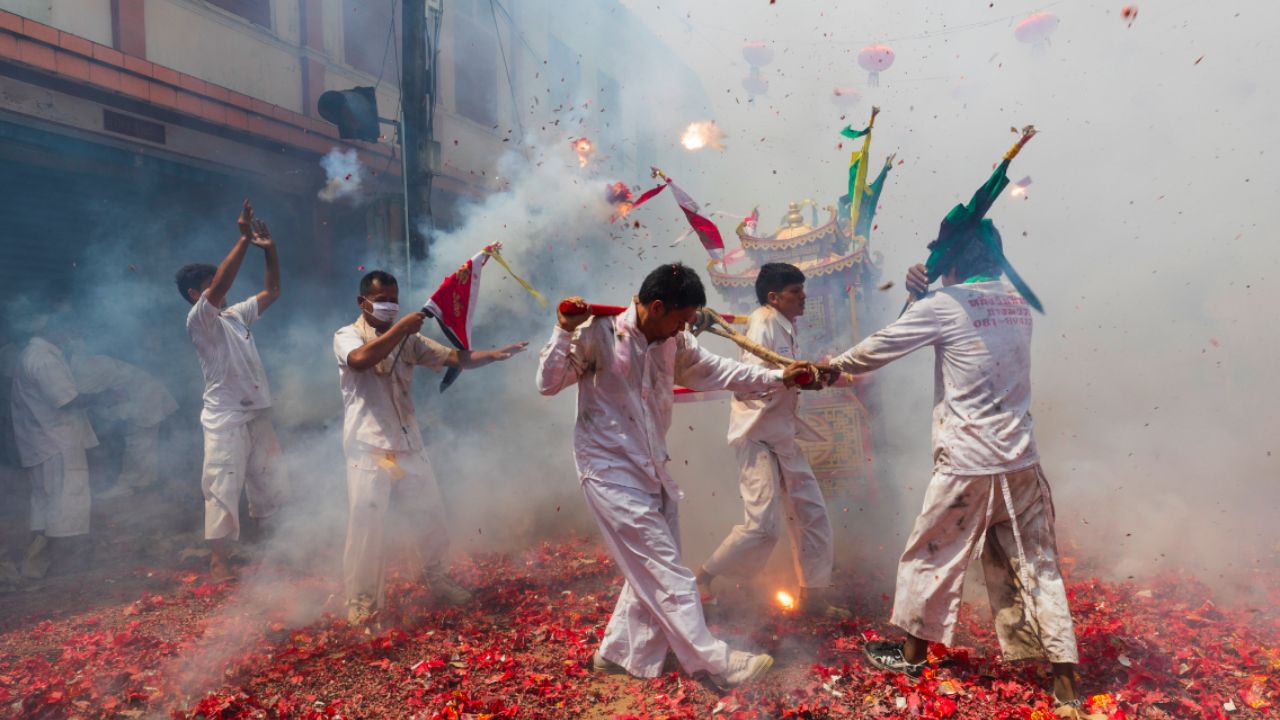 Durant 9 jours, les fidèles suivent un régime végétarien en l’honneur des Neuf Empereurs Dieux. Le festival est réputé pour ses rituels impressionnants et parfois choquants, où des ascètes se livrent à des actes d’automutilation (piercings, marches sur le feu) pour prouver leur pureté spirituelle et repousser les mauvais esprits. Une immersion culturelle fascinante !